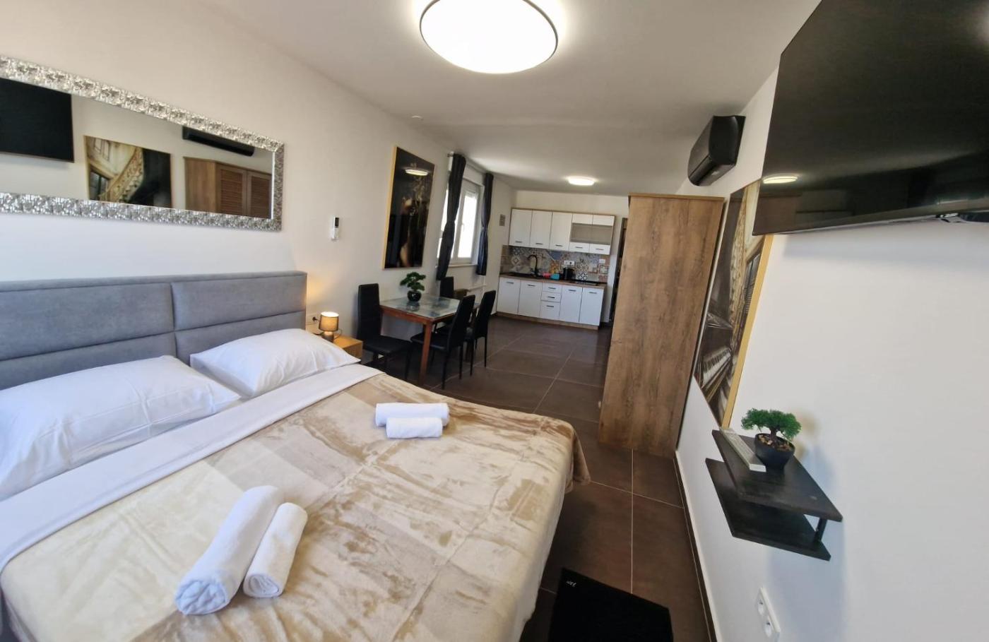 Deluxe Studio. The studio features air conditioning, a seating area, as well as a private bathroom boasting a walk-in shower and a hairdryer. The studios kitchen is available for cooking and storing food. The studio provides a dining area, a wardrobe, a tiled floor, heating, as well as a flat-screen TV. The unit has 1 bed.